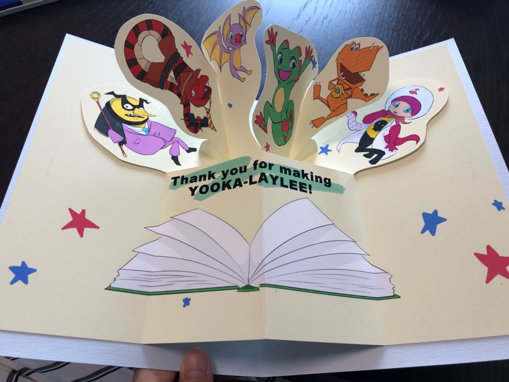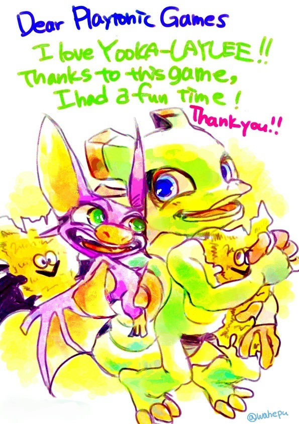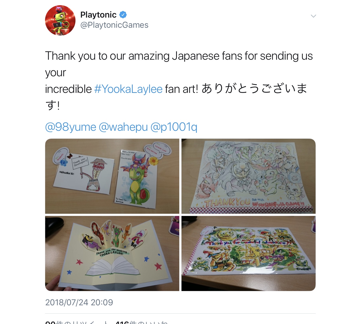 Playtonic Gamesのスタッフさんにファンレターを送る企画② 未選択 2018年09月19日 参加してくださったみなさま、お待たせ致しました・・! ここしばらくは仕事の都合で私生活に余裕が無かったので、この企画の記事を書くのが大変遅くなってしまいました;;お待たせして本当に申し訳ございません・・( ;∀;) ようやく書き上げたので投稿致します。 _______________________ 前回の記事で、募集しました「Playtonic Gamesのスタッフさんにファンレターを送る企画」! この企画に参加して下さいました、 月星さん、つみれさん、みさことさん、わへっぷさんのご協力により、とても豪華なファンレターを送る事ができました。本当にありがとうございます! そして、この企画は思いもよらなかった終わりを迎えました・・! 続きで参加者様達の素敵なファンレター紹介します。 ファンレター企画。 企画を立ち上げた時は、正直言って不安しかありませんでした・・ まず、この企画を立ち上げて、参加してくださる人がいらっしゃるかどうかという点で不安に思っていましたね;;この企画自体、怪しすぎるのでは無いかと!(苦笑 それと、いくらファンレターといえども、日本という島国から送られてきた郵送物をきちんと受け取ってくださるのかと変なマイナス思考になったりでw そんな不安な気持ちを胸に抱きつつ生きていたら、 この突発的で怪しい企画に参加したいと声をかけて下さった方が4名もいらっしゃいました・・!ありがたかったです・・! 参加者の方々には締め切りが急だったのもあり、大変な思いをされたかと思います;; それでも締め切り前には送ってくださったので、皆さん仕事速いな・・!と思いました。 では本題の参加者の方々のファンレターです~! ※イラストをクリックすると原寸で表示されます _______________________ ・つみれさん(@tsumirare ) 仲良しな2匹を描いたファンレターを送ってくださいました! 2匹ともぷにぷに感があって可愛いです・・! 普段と違うポジションのレイリーちゃん・・私の目だとレイリーちゃんの座り方と足にセクシーさを感じます・・(^ω^) _______________________ ・みさことさん(@LoveKennen ) みさことさんはトラウザーを描いて送ってくださいました! クレヨンで書いたようなタッチがかわいい(*´ー`*) メッセージ看板を持たせているという粋なイラストです・・! ポストカードに印刷したらメッセージカードぽくなって素敵でした。 _______________________ ・わへっぷさん(@wahepu)(HP) このデータを送ってくださった時は、ひょー!!(舞い上がった感情)となりましたw圧倒的ボリューム・・! 1枚目のページをゲットして嬉しそうなユカレイも悶絶しそうなくらいの可愛さ・・、2枚目のはユカレイ主要キャラ集合という豪華なイラストで・・!ユーカとレイリーはゲーム序盤を思い起こさせるようなシーンになってて、ゲーム全体を想像させてくれる素敵なイラストですね・・(///∇//) 皆かわいいですが!贔屓目で見て!Capital Bのボスっぽい感じが可愛い!!!(あとRetroxの隅っこでアピールしているのもお茶目で可愛いです(*´ー`*) _______________________ ・月星ルカさん(@p1001q)(HP) ルカさんのは郵送で現物を送ってくださいましたが・・ これがもう凄かった・・ ペ・・ ペペーン!!!!!! なんと立体メッセージカードです!!!!! 中を見てもいいとの事だったのでお言葉に甘えて拝見させて頂きました! もう開いた瞬間、素敵すぎて笑顔がこぼれましたw可愛さしかり、製品のようなっていねい ユカレイのキャラ達が本からリアル世界に飛び出したかのようで・・!みんな勢いよく出てきた感じがとても可愛らしい・・( ;∀;) ヘビっぽい飛び方をしているトラウザーが面白いですw これは自分のです。久しぶりに色鉛筆を使いました!色うっす… 思ってたような感じにはなりませんでしたが、愛情だけは…!執念とも呼べるような愛情をたっぷりと込めました(..◜ᴗ◝..)笑 ーーーーーーーーーーーーーーーーーーーーーーーーーーー これらの参加者さまの素敵なファンレターを封入したら、かなりのボリュームになりました! 写真じゃ色が飛んでしまったのですが、緑の封筒と赤のマスキングテープでユーカカラーにしました。 そして締め切り翌日に郵便局へ郵送の手続きをしまして、どのぐらいであちらに届くのか尋ねた所、10日~2週間はかかるとの事で。 ファンレターが無事に届くことを願いつつ、10日過ぎるまでは何もないだろうとボーっと日々を過ごしていました。 そして1週間ほど経ったある日、ツイッターでなんと・・なんと・・! 公式さまからの反応があああああああーーーー!!!!!!! まさか直々に公の場でお礼の言葉を頂けるとは思っても見なかったので、見た瞬間に理解できなかったですw この手紙を広げたデスク…スタッフさんの働いている環境をすごい一部ですが、見られて嬉しい… わざわざ広げて写真とってくれたんだなぁと思うとこみ上げてくるものがあります・・ そして無事に手紙が届いたのと、スタッフさんに喜んで頂けて大変嬉しく思い